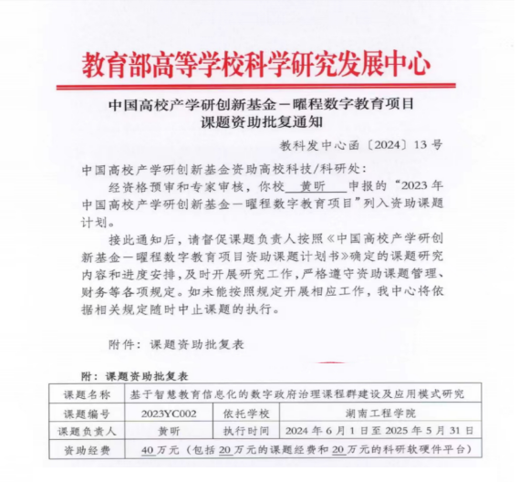近日,教育部高等学校科学研究发展中心发布了《中国高校产学研创新基金——曜程数字教育项目课题资助批复通知》(教科发中心函〔2024〕13号),伟德党委书记黄昕教授申报的课题“基于智慧教育信息化的数字政府治理课程群建设及应用模式研究”列入“2023年中国高校产学研创新基金——曜程数字教育项目”资助课题计划,这是伟德首次获得教育部该类项目资助。