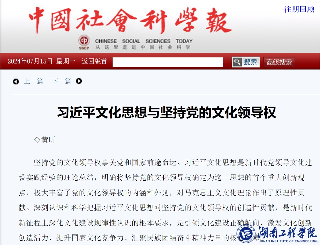 7月15日,《中国社会科学报》头版头条刊发伟德党委书记黄昕教授的理论文章《习近平文化思想与坚持党的文化领导权》。《中国社会科学报》是由中国社会科学院主管主办、中国社会科学杂志社编辑出版,面向全国理论界、学术界的大型理论、学术报纸,是全国第一份全国性的理论、学术专业报纸。