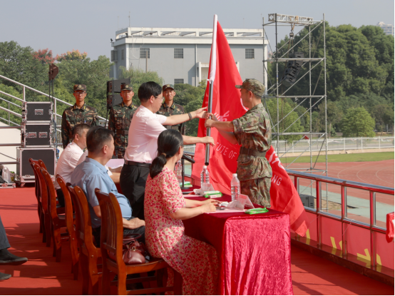 开学典礼后,新生军训动员大会举行。黄昕为军训团授旗。校党委委员、副校长吴志军主持大会。