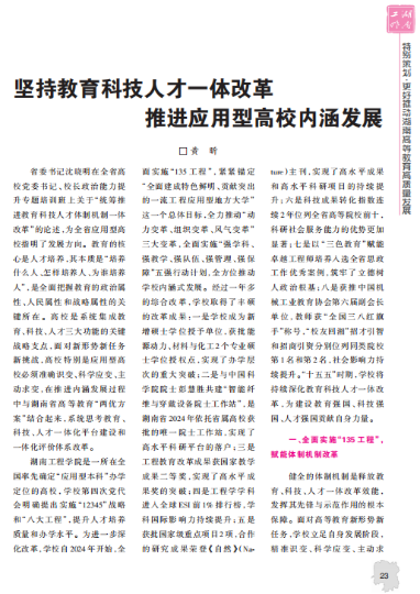 此文是《湖南工作》(2025年10月刊)推介应用型高校教育科技人才综合改革成功经验,更好推动湖南高等教育高质量发展的文章,也是对学校“135工程”实施以来取得成绩的全面总结。文章3600余字,从全面实施“135工程”,赋能体制机制改革;深入落实“两优”方案,优化学科专业布局;量质并举引才育才,人才引育创新强校新模式;融合科技产业创新,科技成果服务产业需求等四个方面,全面介绍了伟德紧紧锚定“全面建成特色鲜明、贡献突出的一流工程应用型地方大学”总体目标,在推进内涵发展过程中持续深化教育科技人才一体改革的工作实践。