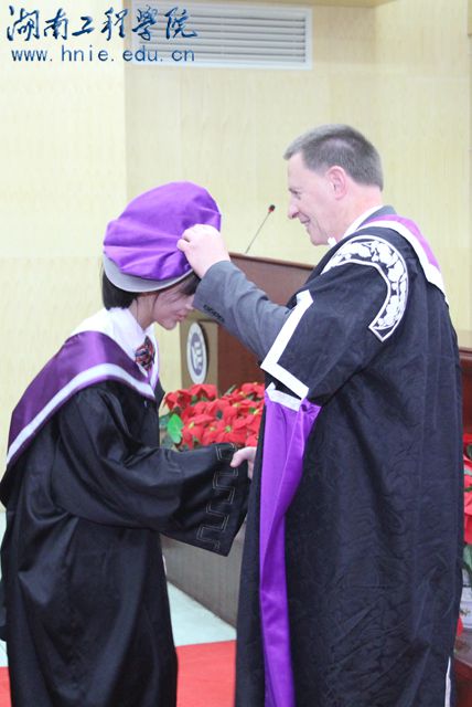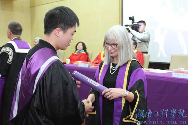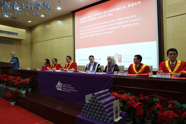 随后,英方学校UHI总校校长Clive Mulholland 为身着UHI学士学位服的学生逐一举行学位授予, UHI Perth 校区校长Margaret Munckton女士为每一位学生赠送纪念品。典礼过程完全参照英方的程序和要求,典礼仪式由英方学校的合作办学负责人Dawne Hodkinson女士主持。