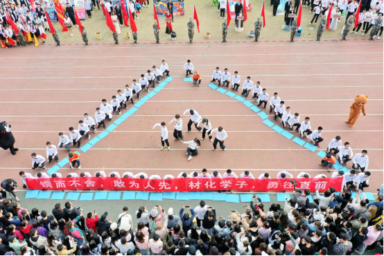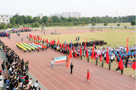 伴随着《运动员进行曲》的乐曲声,国旗护卫队、红旗方阵、13个学院代表队、研究生代表队和教工代表队依次从主席台前走过。他们精神饱满,步伐整齐,口号响亮,充分展现了湖工师生朝气蓬勃、奋发向上的精神面貌。来自外国语学院的方阵队首先出场,他们通过动感的舞蹈表演,展示了大学生的青春风采;研究生代表队手持红黄色旗炽,通过变换队形,呈现出转动的“风机”造型,象征风力发电蓬勃发展;纺织服装学院学子身穿历届学生设计、制作的服饰以T台走秀形式展示专业特色;材料与化工学院的机械舞、应用技术学院的旗袍秀……各方阵表演各具特色,引来看台上观众们阵阵掌声。