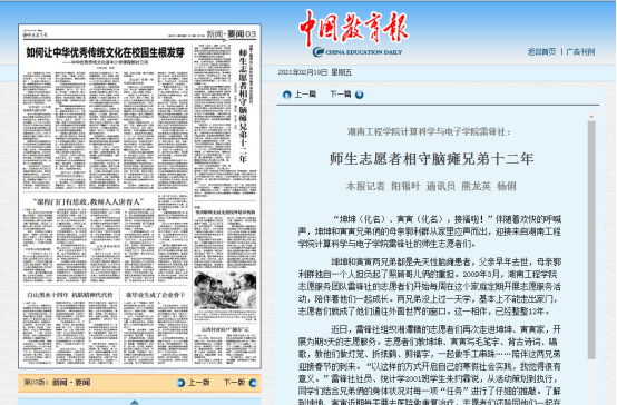 学院坚持将社会实践作为教育引导学生学以致用、用以促学、知行合一的重要途径。学院学生的社会实践活动以公益社团雷锋社为主体开展。雷锋社成立于2001年,一直坚持“志愿服务在身边,有爱就有明天”,大力弘扬“奉献、友爱、互助、进步”的志愿者精神。学院与湘潭市党史馆、湘潭市风景园林中心宝塔(木鱼湖)公园共建立了4个社会实践基地,定期定点进行志愿活动。近5年,定点志愿服务进驻11000余人次。还组织开展“三月雷锋月”系列活动、保卫母亲河湘江、无偿献血、文明劝导、社区环境治理等21项志愿活动。雷锋社志愿者每周定点前往脑瘫兄弟坤坤寅寅家开展爱心陪伴,迄今已经整整12年。每年师生志愿者们还帮坤坤寅寅举行爱心义卖、开展“我陪坤坤寅寅游校园”等系列活动,中国教育报、湖南日报、中国教育新闻网、湖南教育网等多家媒体多次进行报道,引起广泛的社会反响。