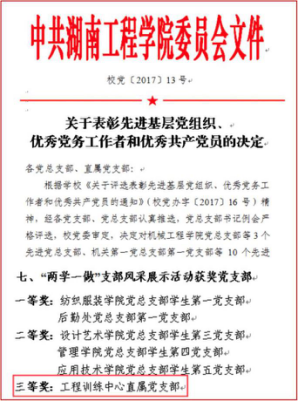 工程训练中心认真落实全面从严治党的要求,牢牢把握意识形态工作的主动权,不断加强组织建设,创建学习型党组织,制定学习计划,拓宽学习途径;强化阵地建设,“党员活动室”布置规范,设立“党务公开栏”推进党务公开,利用“党建学习角”拓展理论学习阵地;机构设置更加合理规范,支部书记实现了双带头人的全覆盖,选拔作风扎实、工作责任心强的老师担任支委会成员,班子成员之间配合默契,工作效率高、成效好;完善基层党组织工作规范,推进决策科学化、民主化,中心重大事情经支委会研究再提交党政联席会议决定,充分发挥党组织的政治核心作用和监督保证作用;深入开展主题活动,增强党组织的凝聚力和战斗力,促进中心工作全面协调发展;加强党风廉政建设的自检自查,层层签订党风廉政建设责任书,党风廉政建设工作稳步推进。2016年获伟德bv1946官网“支部风采展示”活动三等奖,2020年工训中心党总支一支部被评为“样板支部”,二支部书记刘美华教师讲授的党课《弘扬艰苦奋斗精神 创造美好湖工》获伟德bv1946官网精品党课三等奖、《“训赛创服”一体化实践育人体系研究》立项为校级思想政治工作精品项目。