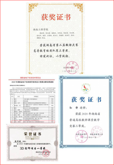 认定校级精品在线开放课程2门,认定省级一流本科课程4门;主编出版教材3部:《工程训练—金工实习》《金工与先进制造实习》和《电路分析简明教程》(第三版);2019年《项目驱动与科技创新相结合的工程训练模块化教学改革与实践》获省级教学成果二等奖、校级教学成果一等奖。构建“一梁、二核、四融合”的工程训练新模式下的创新创业教育体系,2020年获批湖南省普通高校创新创业教育中心——智能制造大学生创新创业教育中心。