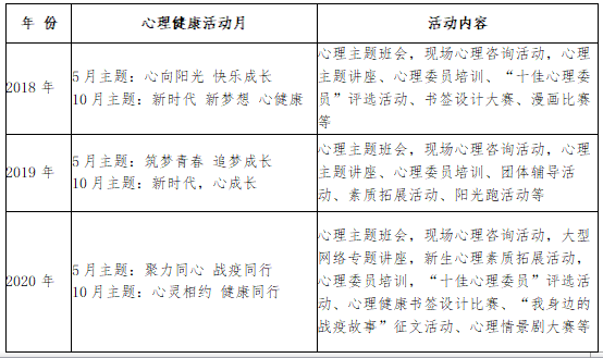 精准关心。实行“四五一”机制,即“五早”(早发现、早报告、早研制、早预防、早控制);“五对象”(贫困生、失意生、学习困难生、特殊家庭生、异常表现生);“五时段”(考试、假期、重大活动、失意、季节转换时);“五宁可”(宁可虚惊不可麻痹、宁可信其有不可信其无、宁可信其大不可信其小、宁可误报不可不报、宁可辛劳不可厌烦);“一机制”即“重点力量—组织落实—培训制度—汇报制度”,并开通了咨询热线,安排心理咨询老师值班。学校心理健康教育中心还为学生提供了心理健康测试与跟踪,举办了心理健康文化月、开展心理讲座等活动,“伟德bv1946官网心理健康教育中心”微信号关注达6万人,心理普查和心理访谈率均达100%,多次获评“湖南省高校心理健康教育先进单位”。