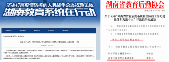 疫情防控取得重大战略成果。圆满完成线上教学和有序复学,全校无一例新冠肺炎疫情发生,获“湖南省教育后勤系统疫情防控工作先进集体”荣誉称号。发挥“湖工智慧”,为企业提供技术资询和科技攻关,助力疫情防控和企业复工复产,获科技部科技助力经济2020年重点课题1项、湘潭市抗疫课题1项,募集47万元捐款和物资支援抗疫一线。