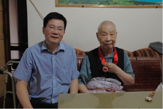 党委副书记、校长易兵为有着69年党龄的老党员曾仁成送上“光荣在党50年”纪念章