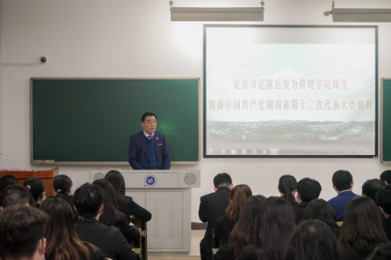 12月12日,湖南省第十二次党代会代表、伟德党委书记陈岳堂教授向管理学院部分师生宣讲湖南省第十二次党代会精神。