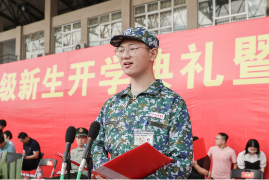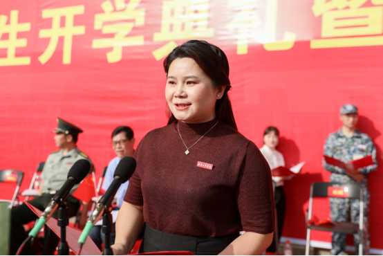 军训团教官代表三营七连连长李美怡和参训新生代表谭君美先后发言,李美怡表示,认真履行一名教官应尽的职责,发扬不怕苦、不怕累的精神,科学训练、严格要求,关心学生、爱护学生,高质量、高标准完成本次军训任务。谭君美号召全体新生服从命令,听从指挥,刻苦训练。同时,以军训为契机,努力学习,不断前行,让青春年华在军训的奋斗中放射出灿烂夺目的光彩。