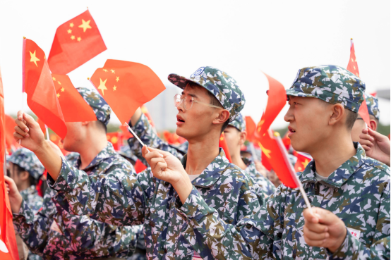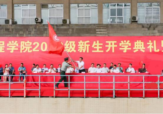 新生开学典礼后举行2022级本部新生军训动员大会。党委书记陈岳堂为军训团授旗。