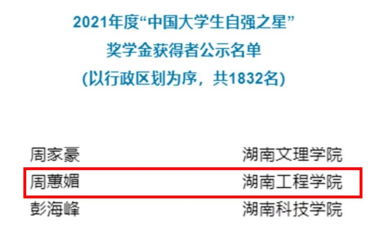 9月28日,共青团中央、全国学联公布了2021年度“中国大学生自强之星”奖学金获得者名单,伟德管理学院会计学2003班周蕙媚获此殊荣,展示了伟德学子热爱祖国、品行优良、不畏艰难、自强不息的青春风采。