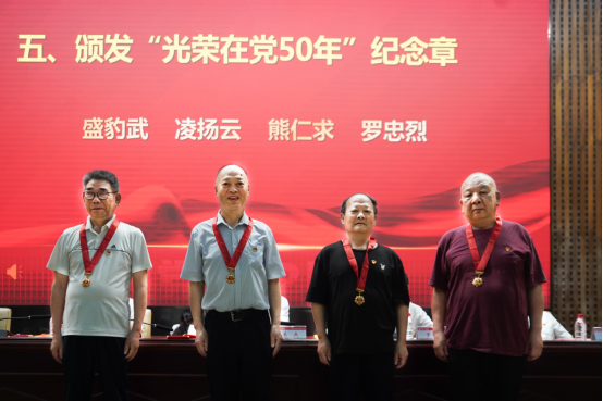 随后,与会校领导向学校“光荣在党50年”的4位老党员代表盛豹武、凌扬云、熊仁求、罗忠烈颁发纪念章,并为受表彰的先进集体、优秀个人代表颁奖,为省级以上先进集体和个人佩挂绶带。大会表彰了管理学院教工第二党支部等23个先进基层党组织,刘喜梅等113名优秀个人。先进基层党组织代表电气与信息工程学院党委书记黄望军、全国党建样板支部管理学院教工第二党支部书记、“双带头人”标兵刘喜梅、优秀党务工作者代表机械工程学院党委书记覃波、优秀共产党员代表材料与化工学院黎晓作典型发言。