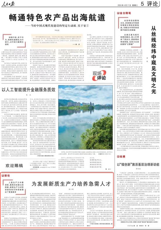 4月17日,党委委员、副校长张小刚在《人民日报》评论版发表以《为发展新质生产力培养急需人才》的理论文章。