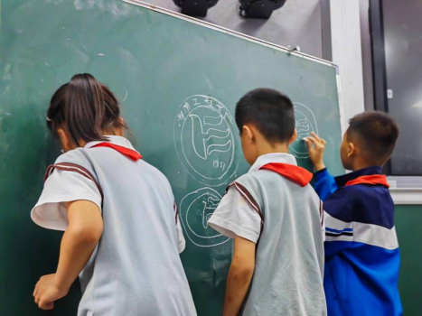 滴水湖小学学生在校史馆宣讲团的指导下绘制学校校徽