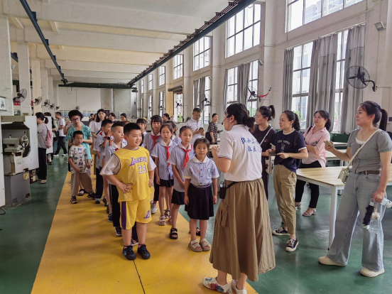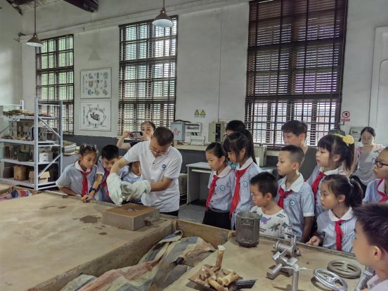 活动分为参观讲解和科技制作体验两个环节。在参观环节,孩子们从综合楼展厅出发,一路途径现代钳工、切削技术、铸造、智能产线等实训室,再到工程实践文化园。在老师的详细讲解下,孩子们对各实训室的设备和加工工艺有了初步地认识,也对我国机械制造技术从传统发展到现代的大致过程有了更直观地了解。