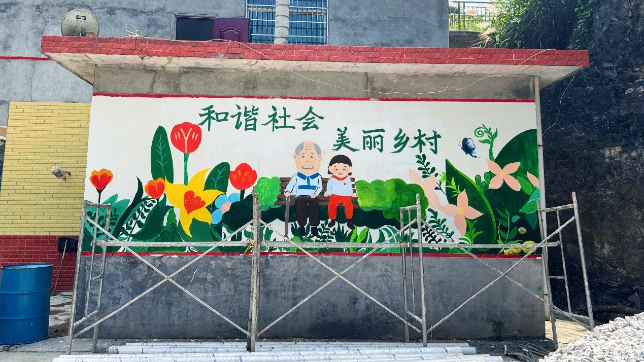 村支部书记刘楚华表示:“希望这些墙绘能够成为我们村的文化名片,不仅为乡村增加生机与活力,还可以让更多的人了解这儿的特色农产品,如寒茶、黄精、玉兰片等。” 了解当地的人文风貌与实际需求后,设计艺术学院实践团队立马投身于墙绘创作中,成员们顶着烈日穿梭于乡间白墙旁,一笔一画,一描一绘,原本单调的墙面,在他们的巧手下焕发出新的生机与活力,不仅美化了乡村环境,更传递出积极向上的文化内涵。