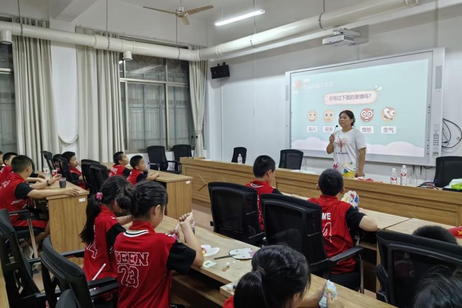 活动以“做情绪的主人”主题讲座拉开序幕,实践团成员通过生动有趣的故事、惟妙惟肖的图片和亲切友好的互动带领小朋友们正确认识情绪,并教会小朋友们在日常生活中如何摆脱消极情绪,做情绪的小主人。接着,实践团成员带领小朋友们开展了“妙笔生花”DIY手绘T恤活动。小朋友们拿起画笔,肆意挥洒着自己的创意,描绘着心中的美好世界。高高飘扬的五星红旗、造型独特的外星飞船、绚丽多彩的花朵……白色的T恤逐渐被小朋友们的童真渲染,展现着他们对未来美好的期盼。