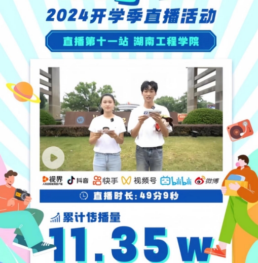 “又是一年开学时,团团带你逛校园~屏幕前的团子们,大家好,我们是‘爱你所爱,想你所想,说你想说’的湖南团团......”9月12日,由共青团湖南省委、湖南省学生联合会指导,共青团湖南省委宣传部主办的“你好,大学生”2024年开学季直播活动第十一站在伟德顺利进行。该活动在人民日报视频客户端、“青年湖南”视频号、“湖南共青团”B站、微博、抖音、快手、“我的飞Young校园”视频号等7个平台同步播出。伟德计算科学与电子学院统计学专业学生张孜慧、纺织服装学院服装表演专业学生楚旭辉两位校园主播带领6000余名新生和近12万名观众一起“云”游湖工校园。