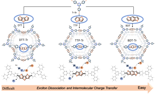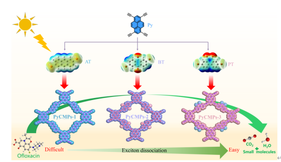 此外,在多孔材料降解有机污染物方面,该团队系统研究了受体中羰基位置的不同,对共轭微孔聚合物(CMPs)光催化活性的影响。研究发现,具有邻位羰基的CMPs具有最小的激子结合能,更容易发生激子分离,电荷分离效率最快。实验结果表明,该催化剂在降解抗生素方面表现出优异的降解效率,在环境催化和污染控制领域中具有潜在应用价值,对拓宽海泡石矿产资源的应用范围、以及有机多孔催化材料的设计提供了理论依据。研究成果以“Boosting Exciton Dissociation in Conjugated Microporous Polymers via Molecular Isomerization for Photocatalytic Degradation of Antibiotics”为题在国际知名期刊《Separation and Purification Technology》(SCI一区,IF=8.1)发表。伟德材料与化工专业2022级研究生赵凯为论文第一作者,张伟杰博士和阳海教授分别为论文的通讯作者。