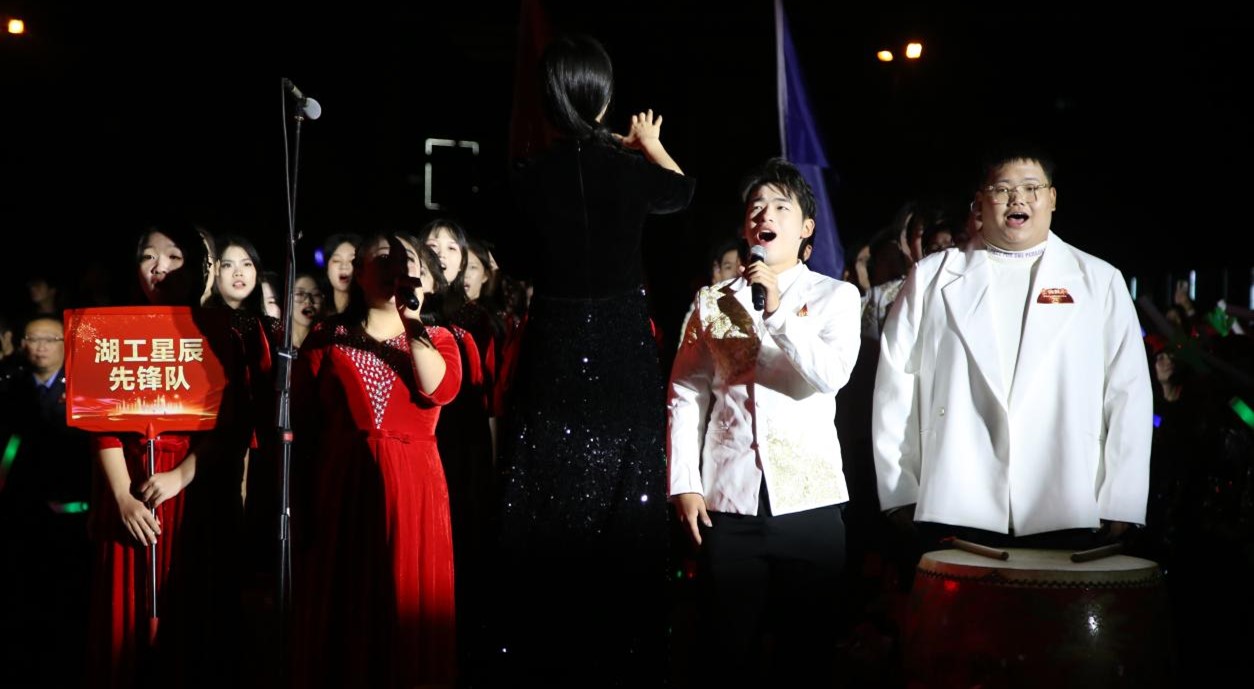 为庆祝中华人民共和国成立75周年,岳塘区建区70周年,讴歌伟大祖国成立以来取得的辉煌成就,引导广大青年学子共抒爱国情怀,10月31日晚,由中共湘潭市岳塘区委、湘潭市岳塘区人民政府联合主办的“放歌新时代,‘岳’唱越亮‘塘’”首届河东群众拉歌大联欢活动在东方红广场举行。校党委委员、副校长张小刚、团委全体老师、大学生艺术团“星辰”合唱团80名合唱队员参加活动。