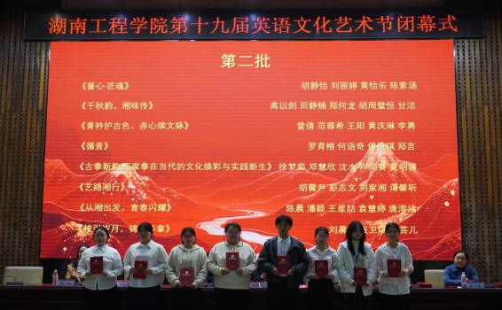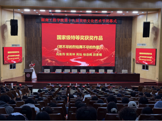 闭幕式在激情洋溢的歌曲中拉开帷幕。表演者用嘹亮的歌声点燃全场,传递梦想与力量。随后,“用英语讲好湖南故事”短视频大赛全国特等奖作品《燃不尽的烈焰 舞不尽的热爱》带领师生走进湘潭火龙舞,展现传统技艺在现代化、年轻化进程中的传承与创新,诠释深厚的文化韧性与精神力量。英语配音大赛获奖团队现场演绎《青春变形记》片段,将语言艺术与青春魅力完美结合,赢得全场喝彩。
