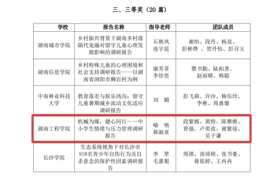 近日,第四届湖南省高校“健心践行”暑期社会实践调研报告评选结果公布。伟德机械工程学院提交的《机械为媒,健心同行——中小学生情绪与压力管理调研报告》获三等奖。