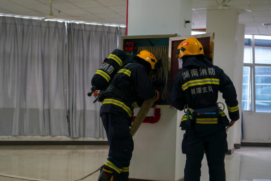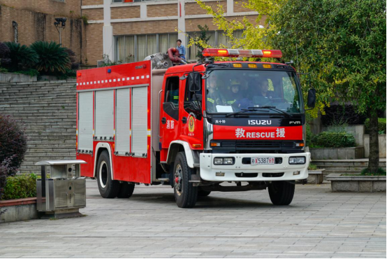 “呜……呜……呜……”两辆消防车驶入校园。扑救火情刻不容缓,消防队员迅速组织灭火行动,他们取出消防水带、灭火器等设备,赶往事发地点控制火势。队员们排成一排,在靠近火场的地方建立起了攻守防线,转眼之间,高压水流喷薄而出,“大火”被成功扑灭。