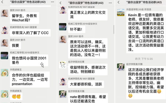“I’m so excited to talk with you guys! Love you all!” 已经在中国定居多年的美国友人Nate是半个“中国通”,他深入浅出地传达了跨文化交际的基本概念和技巧,使同学们很快克服了对跨文化交际的心理障碍,树立起了出国交流的信心。