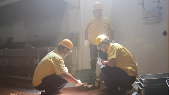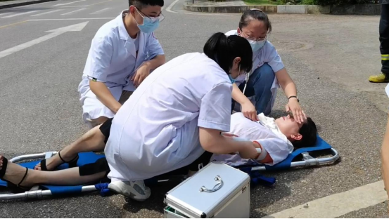 演练模拟学校明德二食堂燃气管道被撞坏,导致燃气大量泄漏并引发大火。学校发现情况后紧急拨打湘潭新奥燃气有限公司、湘潭市消防救援支队、湘潭市妇幼保健医院联系电话,要求相关部门立即赶到现场进行救援,并由保卫处、后勤基建处、校医组成初期应急队伍奔赴现场,拉起警戒线,组织人员疏散,并关闭现场电源。湘潭市消防支队赶到现场,进火场救出被困受伤人员,控制火势。待火势控制后,湘潭新奥燃气有限公司抢修队伍迅速来到明德二食堂主阀位置关阀放散、修复管道。湘潭市妇幼保健医院接到急救电话后立即派出急救车和医生赶赴现场对伤员进行救护。在湘潭市消防救援支队和湘潭新奥燃气有限公司的通力合作下,险情得到了有效的控制。