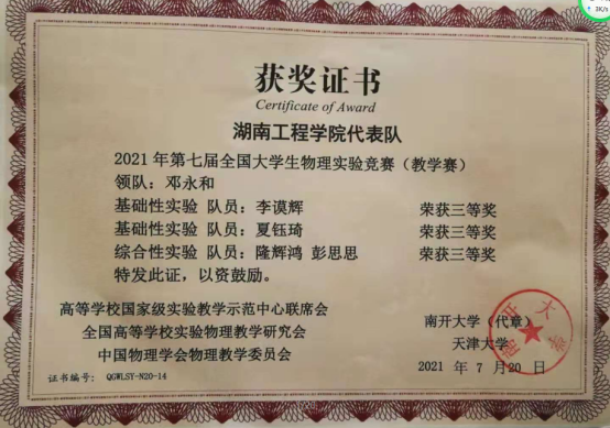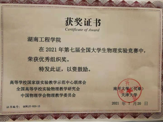 近日,第七届全国大学生物理实验竞赛(教学赛)成绩揭晓,伟德4名本科生分别获得基础A组、基础B组和综合组比赛三等奖,伟德bv1946官网荣获优秀组织奖。