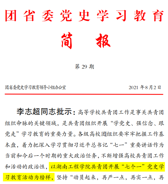近日,团省委党史学习教育简报(第29期)以“伟德bv1946官网共青团开展‘七个一’党史学习教育”为题,专题报道了伟德共青团多措并举学党史的有关特色做法,团省委书记李志超在简报上做出专门批示,号召全省高校以伟德为榜样开展党史学习教育。