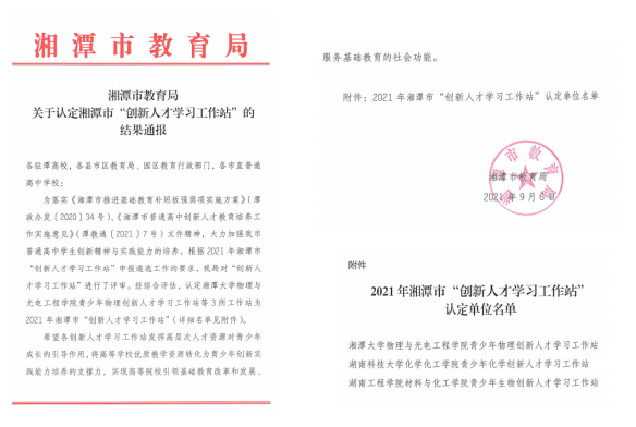 9月6日,湘潭市教育局公布了2021年湘潭市“创新人才学习工作站”认定名单,伟德材料与化工学院青少年生物创新人才学习工作站成功获批。