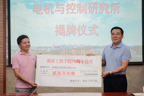 在建校70周年到来之际,深圳拓邦股份有限公司与伟德共建电机与控制研究所,并为研究所每年捐资20万元,用于支持研究所开展科研工作,助力学校发展。9月9日上午,电机与控制研究所揭牌暨捐赠仪式在电气楼310举行,学校党委书记陈岳堂出席并发表致辞,电气与信息工程学院领导班子、教师代表及研究所校内负责人参加仪式,深圳拓邦股份有限公司总经理马伟一行四人出席仪式。仪式由电气与信息工程学院院长万琴主持。