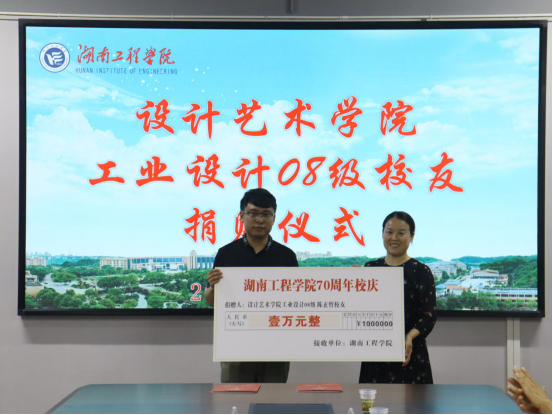 9月9日下午,设计艺术学院工业设计专业2008级李叶妮、陈玄哲两位校友为母校建校七十周年捐赠仪式在五教会议室举行。校党委委员、副校长向前出席,校友办、设计艺术学院相关负责人,工业设计专业0802班班主任彭烈洪及部分学生代表参加捐赠仪式。设计艺术学院院长王兴业主持仪式。