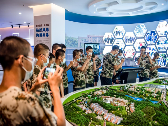 回望校史,传承精神。在学生教官的带领下,佩戴口罩、测量体温、排队等候,参观的同学们井然有序。走进校史馆序厅,深蓝的星空顶映衬着学校校徽,蕴含湖工特色的古铜色浮雕,让同学们为之震撼。
