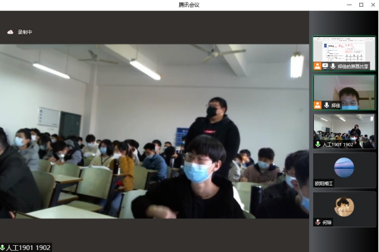 计算机与通信学院为每个上课班级配置一个电脑摄像头(带麦克风功能)、一名协助人员(教师或学生),由协助人员在线下教室安装和调试好在线教学所需的摄像头、腾讯会议等软硬件设备。线下课堂学生通过投影屏幕中的腾讯会议集中聆听远程端教师授课,授课教师也可以用教室配置的摄像头在远程端实时观察和了解学生听课动态,师生通过摄像头麦克风和扬声器实现语音互动问答和交流。
