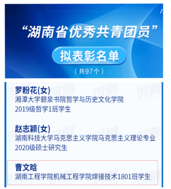 近日,共青团湖南省委、共青团湘潭市委、共青团湘潭市岳塘区委相继做出表彰决定,对一批基层团组织和个人授予五四红旗团委、五四红旗团支部、优秀共青团员、优秀共青团干部荣誉称号。伟德共获省级奖项2项、市级奖项5项、区级奖项28项,其中伟德团委书记刘琤获评湖南省优秀共青团干部荣誉称号,机械工程学院焊接技术1801班学生曹文晗获评湖南省优秀共青团员荣誉称号。
