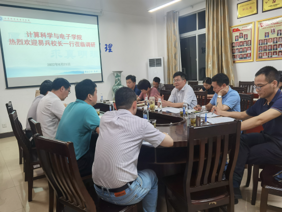 6月21日晚,党委副书记、校长易兵,党委委员、副校长罗毅平前往计算科学与电子学院,围绕师资队伍建设、通识教育课程数学类课程教学等方面进行调研。