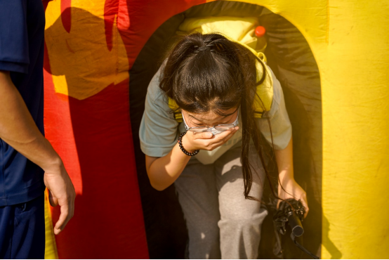 “在模拟逃生帐篷中,大家弯腰、低头、用手捂住口鼻、摸墙。”模拟逃生帐篷内各设一个进出口,室内分隔成迂回曲折的过道,消防员在逃生帐篷里放置烟雾弹,利用帐篷的封闭、黑暗、浓烟等特点,让师生感受火灾现场。在场师生分批次进入逃生帐篷,利用火灾逃生技巧,寻找出口。
