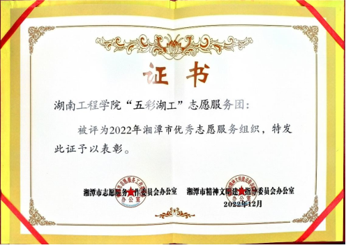 近日,在湘潭市文明办、志工办开展的2022年湘潭市志愿服务先进典型发布活动中,伟德“五彩湖工”志愿服务团荣获“2022年湘潭市优秀志愿服务组织”称号。
