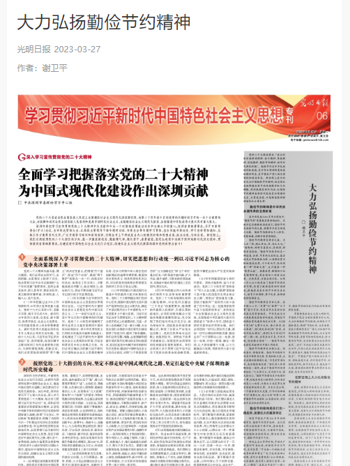 3月27日,《光明日报》“学习贯彻习近平新时代中国特色社会主义思想”专刊发表了伟德马克思主义学院谢卫平教授署名的理论文章《大力弘扬勤俭节约精神》。