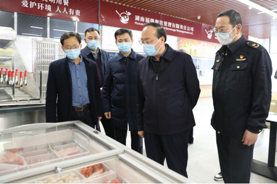 3月29日下午,湖南省湘潭市人大常委会党组成员、副主任蒋立军,湘潭市市场监督管理局党组书记、局长、市委两新工委副书记(兼)赵波,湘潭市岳塘区市场监督管理局局长周刚等一行来伟德开展食品安全督查,党委委员、副校长张小刚及后勤基建处相关负责人陪同检查。