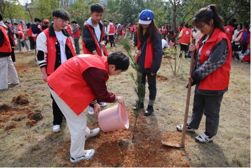 阳光正好,主校区停车坪后山人头攒动,身着红马甲的志愿者们有序组队、领取树苗和种植工具,认真聆听种植指导人员关于植树的注意事项和技巧,熟知挖树坑的大小与深度、三埋两踩一提苗等基本知识。简单地讲解后,各志愿者在负责人指引下,3人一组分别开始植树活动,大家抡锄掘坑、扶树掩土、踩土夯苗、提桶浇水,相互配合,欢声笑语中洋溢着满满的青春气息和劳作的热情。