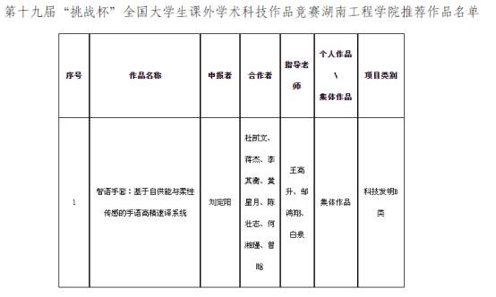 根据《关于组织开展第十九届“挑战杯”全国大学生课外学术科技作品竞赛的通知》文件要求,伟德参与了第十六届湖南省“挑战杯”大学生课外学术科技作品竞赛,经终审答辩评审和资格审查,伟德拟推选作品《智语手套:基于自供能与柔性传感的手语高精速译系统》参加第十九届“挑战杯”全国大学生课外学术科技作品竞赛,现予以公示。