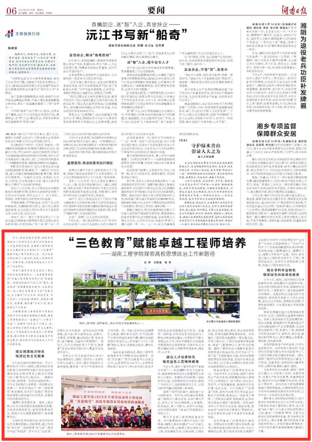 为破解卓越工程师培养中思想政治教育与专业教育深度融合难题,伟德bv1946官网探索出一条通过“三个结合”实施“三色教育”的思政工作模式,即:结合湘潭地方特色实施红色文化教育;结合人才培养特色实施蓝色工匠教育;结合学科专业特色实施绿色环保教育,推动新时代思想政治工作守正创新发展。