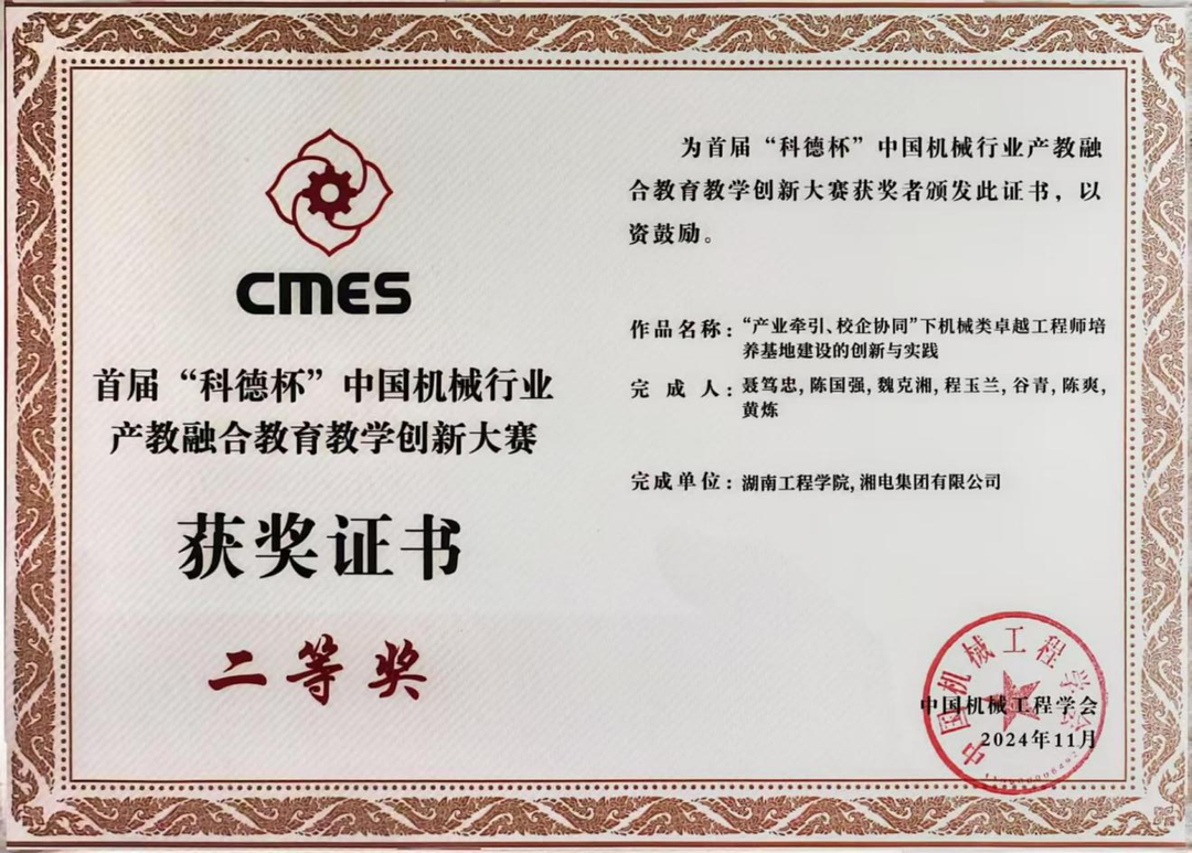 湖南日报·新湖南客户端11月26日讯(通讯员 康家鑫)近日,由中国机械工程学会、中国机械行业卓越工程师教育联盟、中国科技发展基金会主办的首届“科德杯”中国机械行业产教融合教育教学创新大赛全国决赛落下帷幕。伟德bv1946官网机械工程学院与湘电集团有限公司联合申报、伟德bv1946官网聂笃忠博士团队主持申报的《“产业牵引、校企协同”下机械类卓越工程师培养基地建设的创新与实践》获全国二等奖。