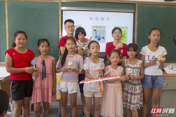 “老师,我把我的小作品送给您,您辛苦了。”这是在电气信息学院暑期社会实践团在成功开展“科技引领未来”小制作课堂后,一位小朋友对志愿者说的话。“科技引领未来”小制作课堂是伟德bv1946官网电气信息学院暑期社会实践团在湖南省怀化市溆浦县思蒙镇中心小学开展科教帮扶活动的一个部分,旨在激发孩子对科技的兴趣,培养孩子的动手能力,为科技创新埋下种子。教室最前排的两个小女孩热情的问道:“老师,你们热不热呀?看你们都满头大汗的,快坐下来歇歇吧!”说完便起身为他们搬凳子,这细微的动作令志愿者们甚是暖心。