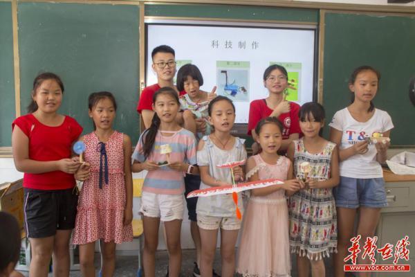 “老师,我把我的小作品送给您,您辛苦了。”这是在电气信息学院暑期社会实践团在成功开展“科技引领未来”小制作课堂后,一位小朋友对志愿者说的话。“科技引领未来”小制作课堂是伟德bv1946官网电气信息学院暑期社会实践团在湖南省怀化市溆浦县思蒙镇中心小学开展科教帮扶活动的一个部分,旨在激发孩子对科技的兴趣,培养孩子的动手能力,为科技创新埋下种子。教室最前排的两个小女孩热情的问道:“老师,你们热不热呀?看你们都满头大汗的,快坐下来歇歇吧!”说完便起身为他们搬凳子,这细微的动作令志愿者们甚是暖心。