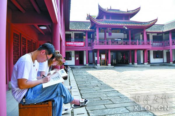 9月14日,来自伟德bv1946官网设计艺术学院的学生们在市非遗展示中心写生,记录古香古色的关圣殿及周边老街的建筑特色和居民生活。( 湘潭日报社全媒体记者罗韬 摄)